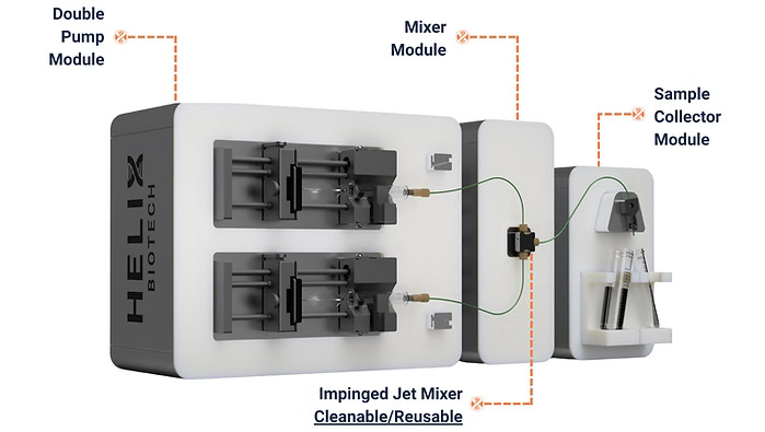 / 產品規格 /Helix Biotech 的 Nova™ 擠射混合(Impinged Jet Mixing, IJM)系統專為協助使用者快速邁向符合 GMP 規範的脂質奈米粒子(LNP)生產流程而設計。無...
