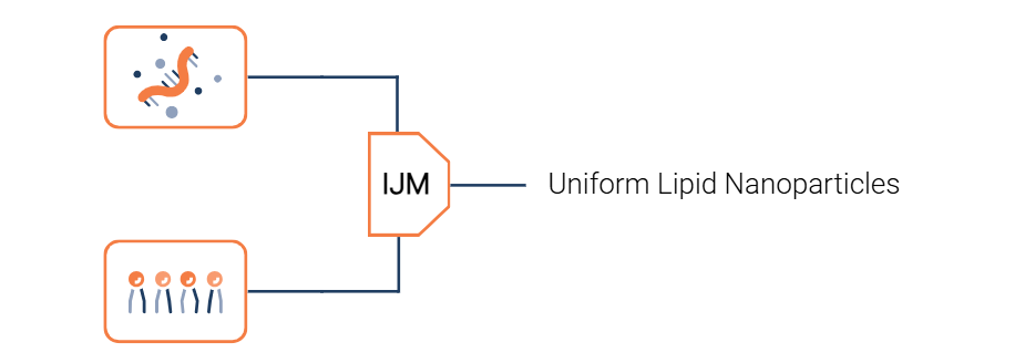 - 湍流混合原理:湍流混合指流體之間的高速、混亂交互作用,大幅提升混合效率與速率。 在 LNP 製程中,利用擠射混合器(Impinged Jet Mixer, IJM)或多入口渦流混合器(Multi-Inlet Vortex Mixer, MIVM),使脂質溶液與水相高速對撞,迅速形成粒徑均一的奈米粒子。