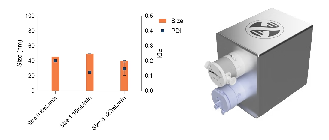 圖2:左圖顯示以 Nova™ 平台製備的脂質奈米粒子,在不同擠射混合器尺寸與流速下仍保持一致的粒徑與 PDI;右圖展示連續流泵浦系統,適用於大規模生產。